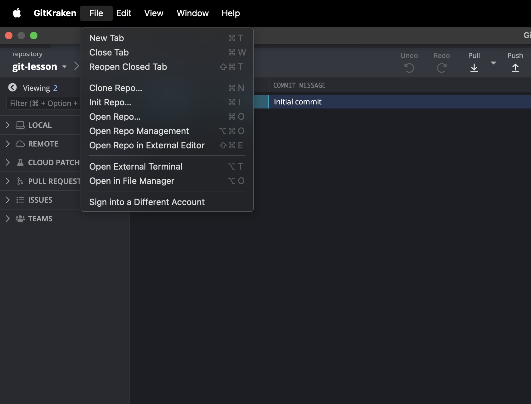 Open the folder (repo) you have just created. In GitKraken Client, you can do this by going to File > Open in File Manager.