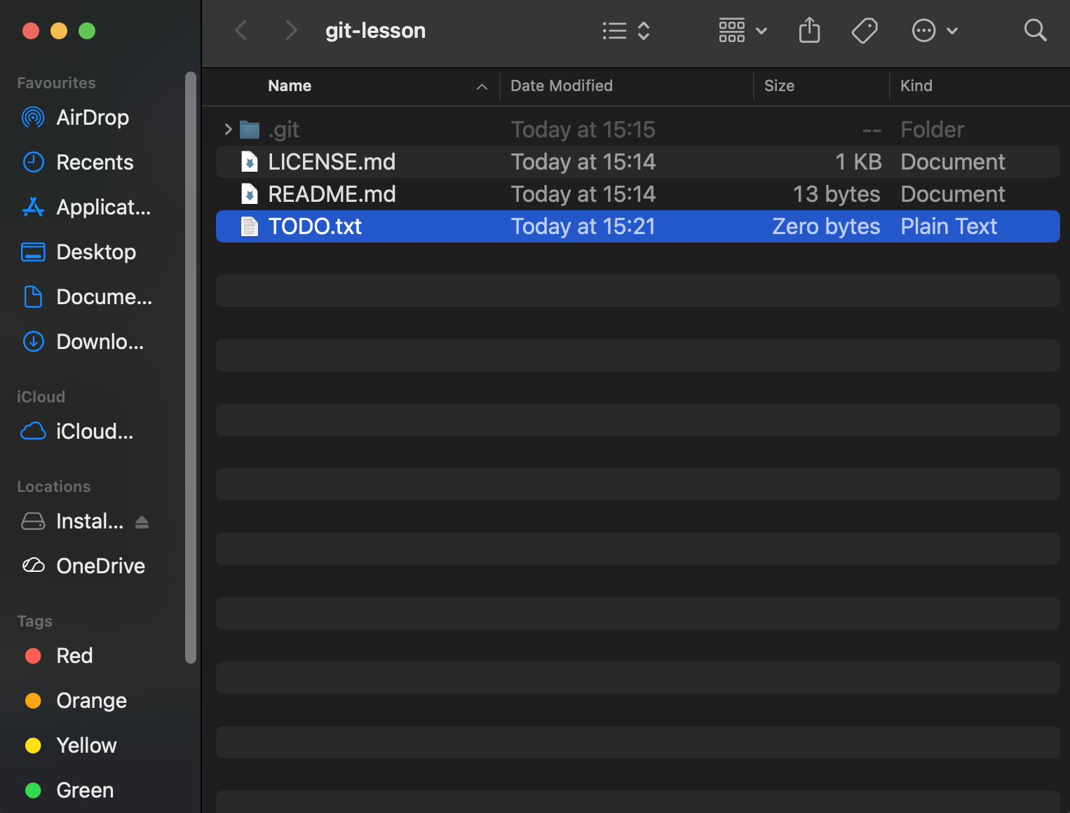Okay! Now we need to do something with the repository. Let’s start with a basic use-case and make a single file that lists some to-do items. The repository is just a normal folder on your computer where you can create and edit files like normal.