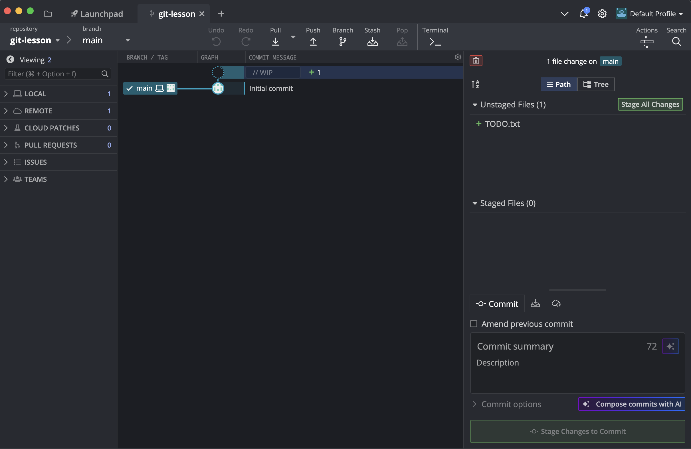 Unstaged Files: Here you have a view of all the local changes of your repository. You can also see the changes done to each file by just clicking on it. You have the option to stage all the changes or some of them. Staging is essentially a commit preparation process.