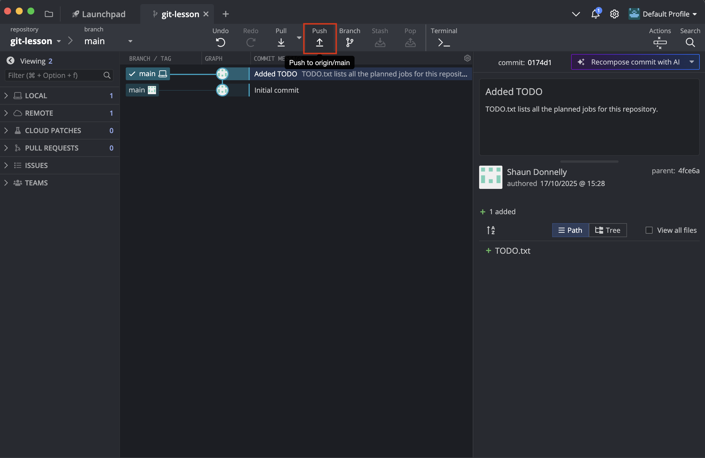 Now that we have commited our changes locally we can push them up to the remote repository. This is done by pressing the Push button on the top of GitKraken Client navigation bar.