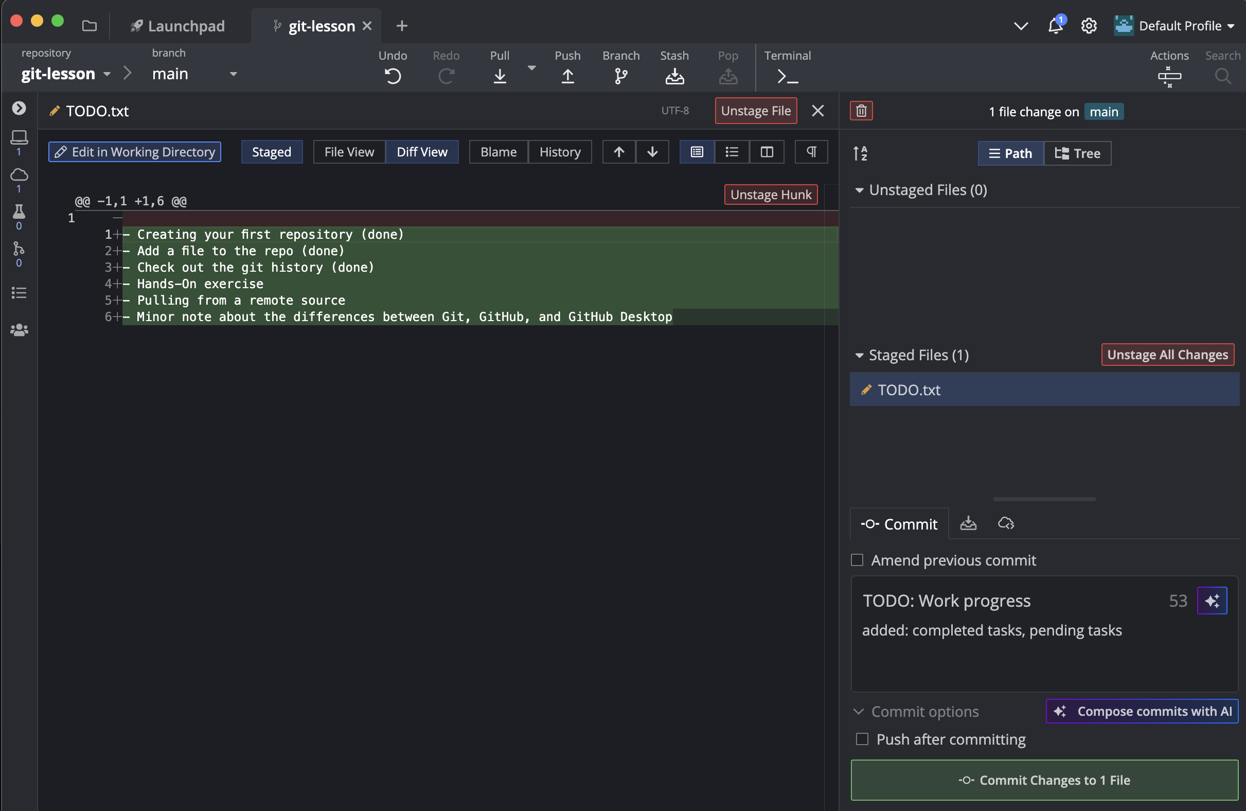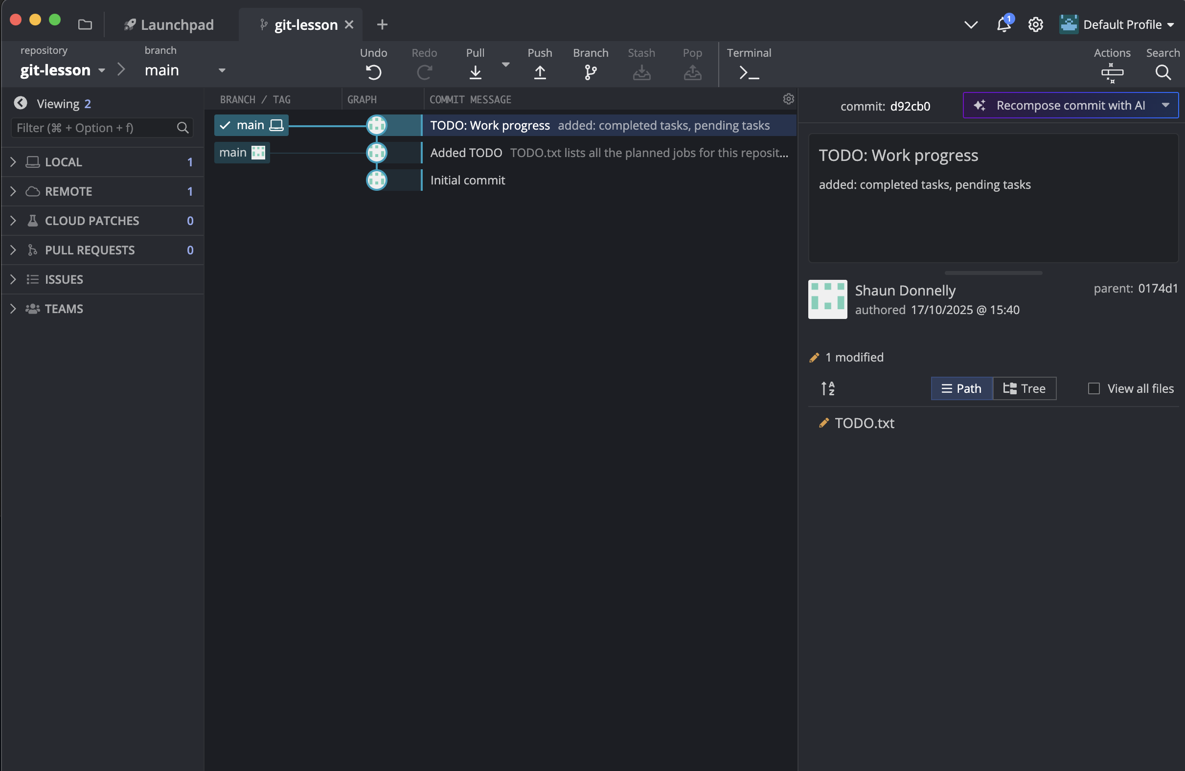 - Commit and push the changes in the TODO.txt. Don’t forget to type a summary message before you commit!